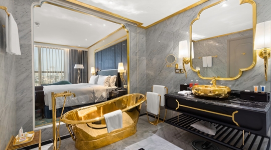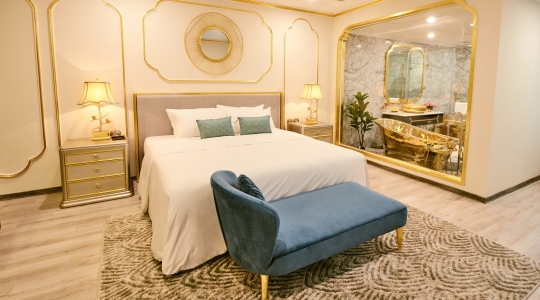 - Phòng nghỉ: Nội thất dát vàng, giường bọc da, ánh sáng vàng ấm áp, tạo cảm giác hoàng gia.